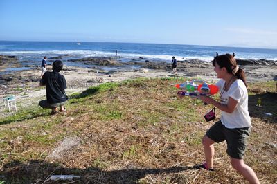 しかも暑い!水鉄砲や凧ではしゃぎつつBBQの準備へ。